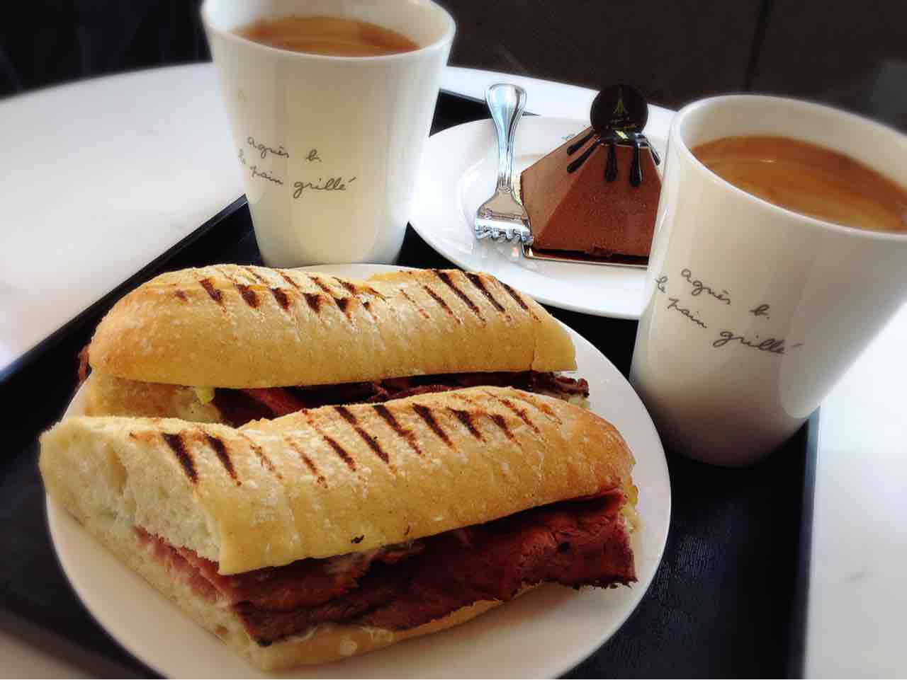 ホテルでゆっくり寝坊を楽しんだ後、散歩のついでにパニーニとチョコレートのケーキを。