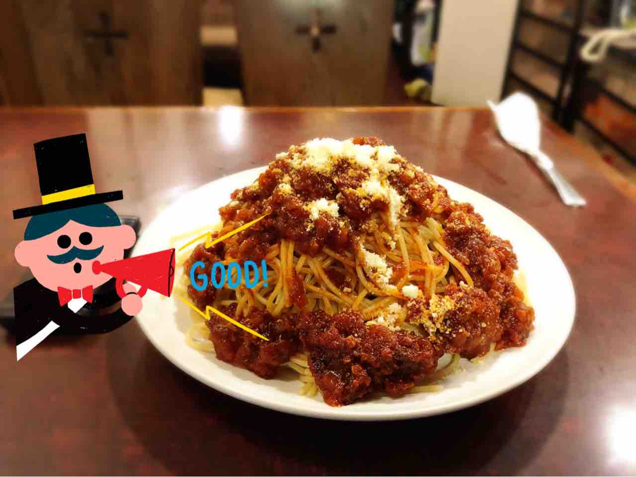 もちろん私もそのつもりだったのだが、見つけてしまったのだよ。ボロネーゼ、いやミートスパを。トマトケチャッピーな薄っぺらなミートソースは好きじゃない。肉の旨味の濃い、そしてほんのり甘味を感じる、学生時代によく食べた大学近くのあの喫茶店のミートスパがもう一度食べたい!って妄想が止められなくなり、つい注文。それ以来この店に行くとナポリタンを食べようと思いつつ必ずミートスパゲッティーを食べてしまう。