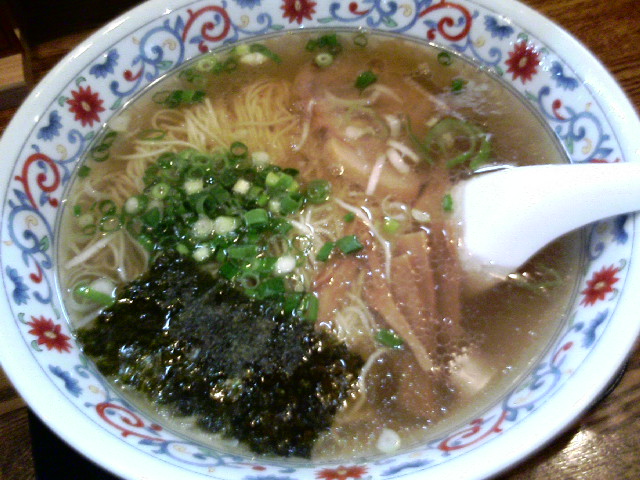 出て来たラーメンを写真に撮ると、カウンターの奥の大将が、話しかけてくれました。「塩ラーメンのスープは透明じゃなきゃダメ。透明度にこだわったスープ」「塩は福建省の塩を使っている」とのこと。実際に薄い琥珀色のきれいに透き通ったスープです。味も非常にあっさりしていている。自家製の細縮れ麺は少し柔らかめです。麺とスープのバランスは良く、あさっりした中にもジンワリと優しい旨味が感じられる一杯です。