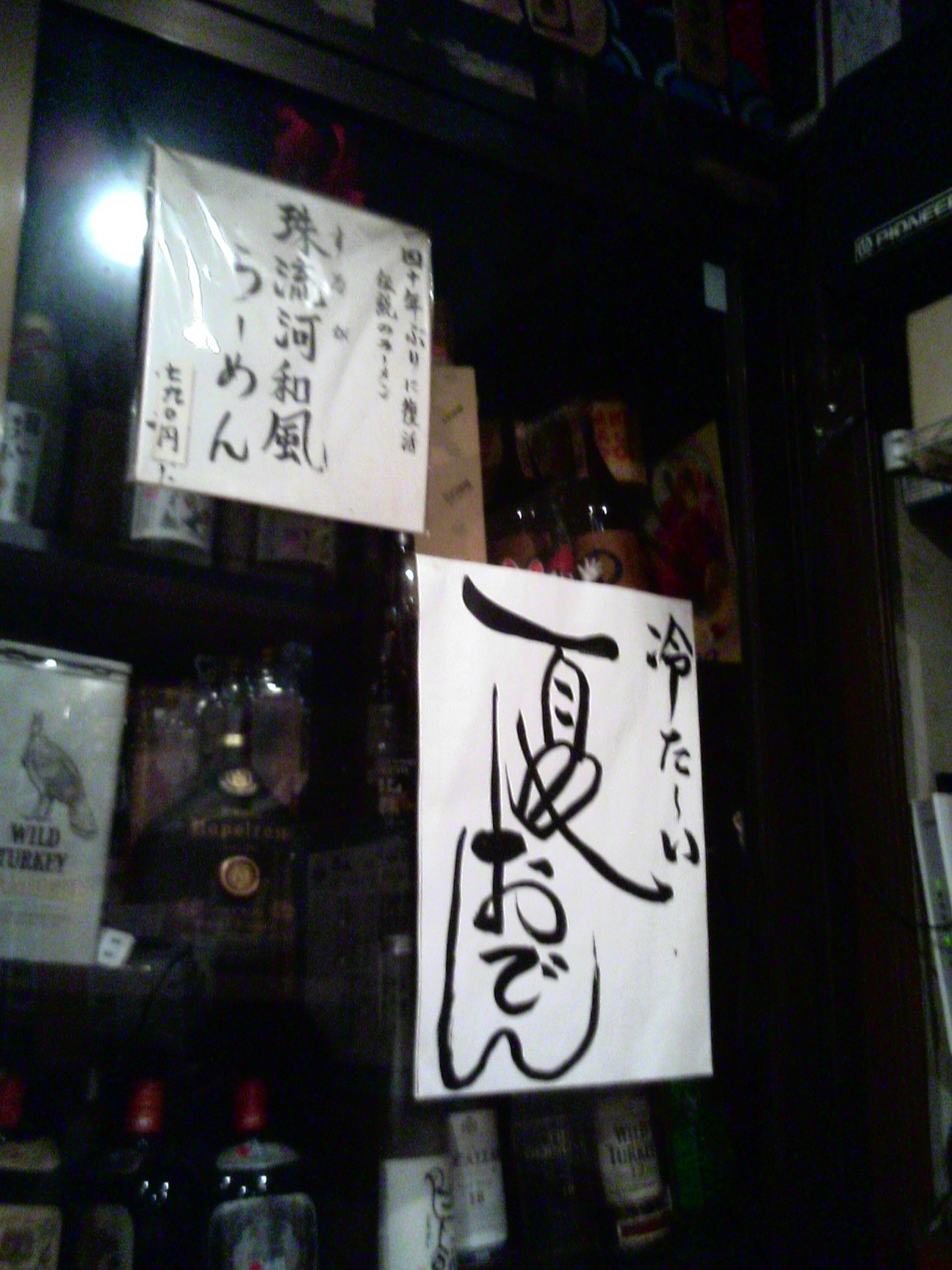 混みあい繁雑な店内、いくつか並ぶおでん鍋、鍋の中も非常に多様な具材があふれカオスな状態。これを隣り合った知らないもの同士が肩を並べ、気を配り譲り合いながら食べる。なんか「おでん屋」っていいっすね。小さな子供を連れて行きましたが、お店のかたにとても良くしてもらいましたし、気分のよい家族の食事でした。