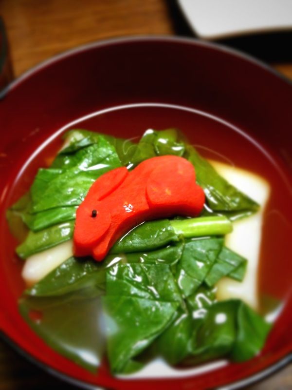 金時人参の赤いうさぎを買って、子供達のお雑煮にのせてあげました。