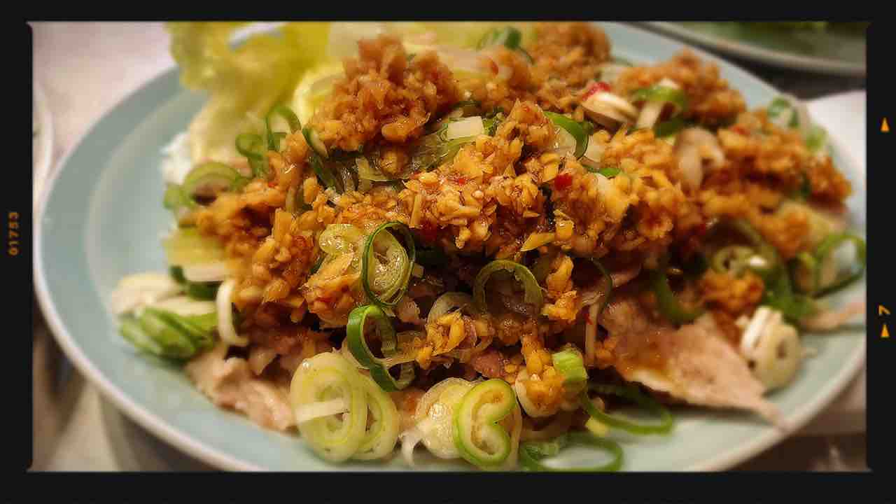 茹でた豚肉にニンニク生姜ネギたっぷりと醤油だれでさっぱりピリリといただく。