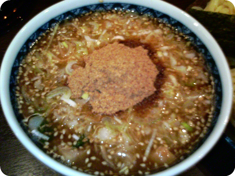 そしてこのつけ汁。胡麻と刻んだネギが浮かび、見るからに濃厚そうなスープです。まん中には魚(煮干や節でしょうか)を粉にしたものがこんもりと盛られている。先日食べた【六厘舎】のそれを思い出します。
