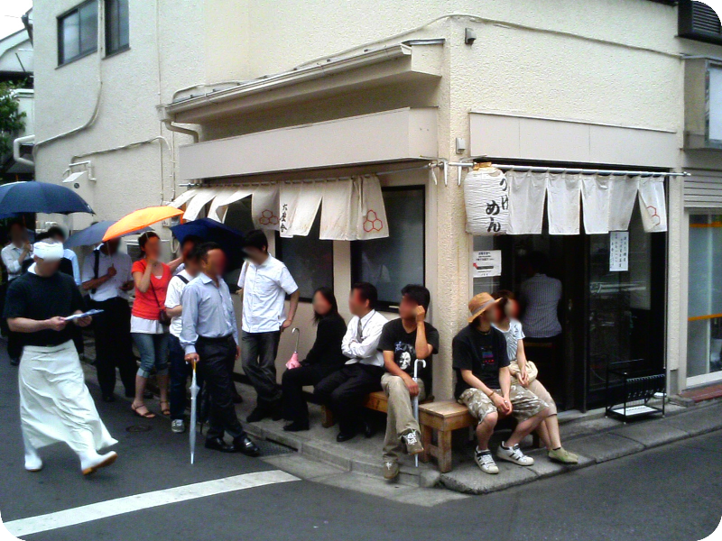平日の昼12時を少し回ったぐらいに時間で、この日は20人強の行列です。店はカウンターだけの12席。総入れ替え製なので2回転分待てば店に入れます。時計を見ていると1回転は約17分。実際に2回転分35分ほどの待ちで店に入れました。店に入る前にお店のかたが1回転分12人の注文を取っているので、回転も早いのでしょう。