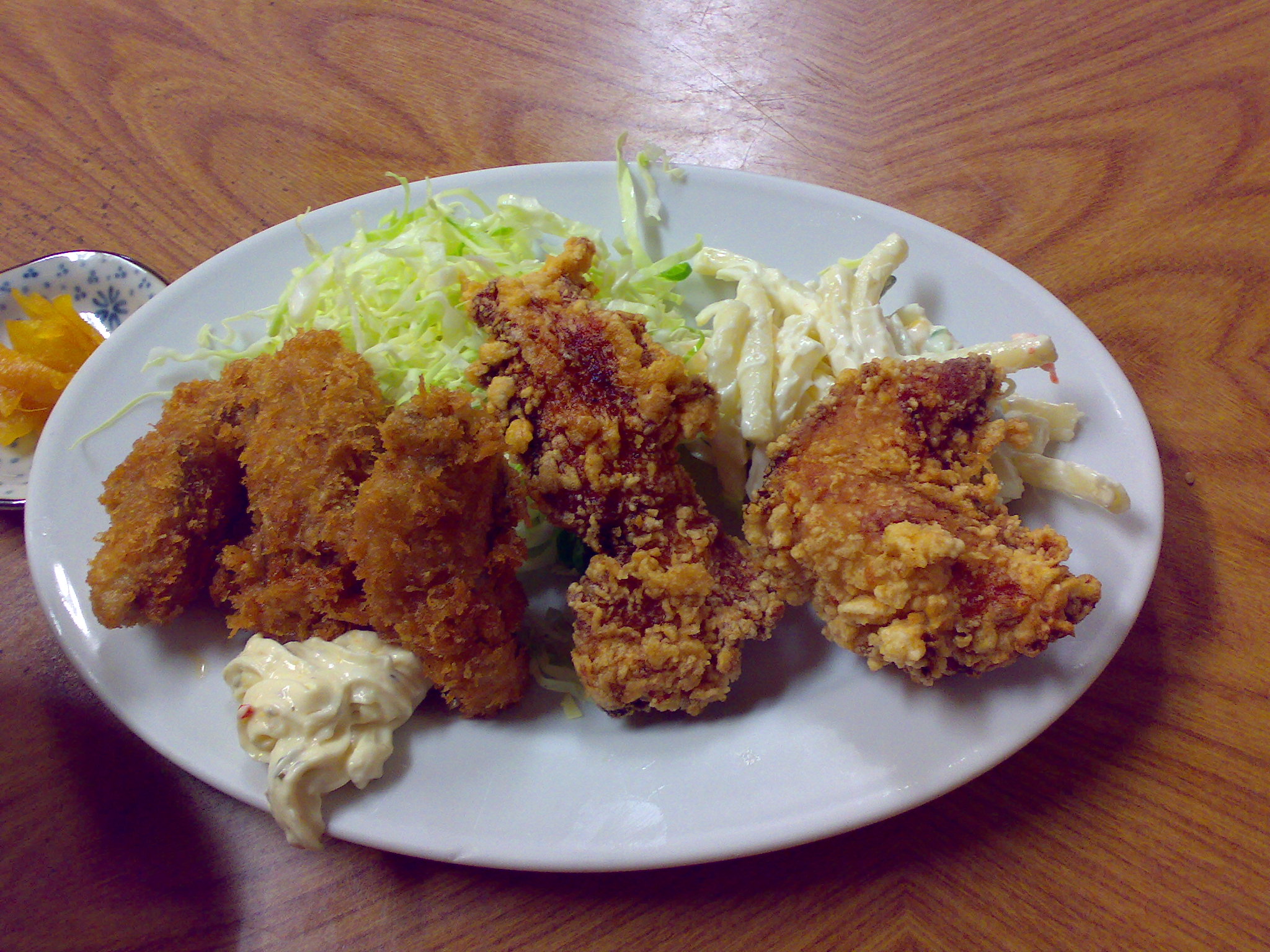 唐揚げも多いのですが、山盛りキャベツに奥に見えるサラスパ。これが普通にスパゲッティーの一人前ぐらいあるんじゃないかと(爆)。