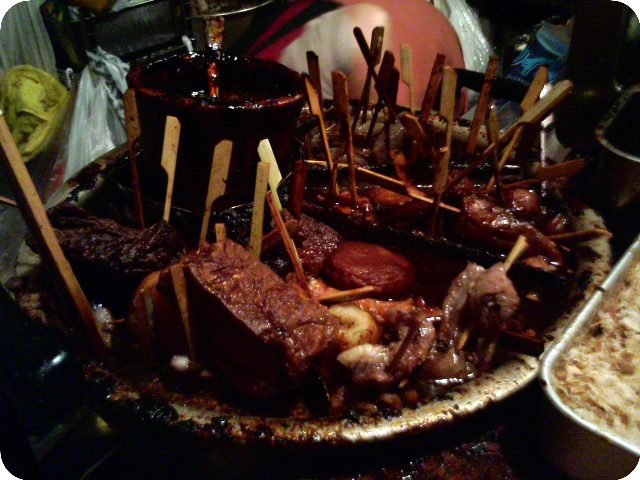 おでん鍋は写真のとおりカオスです(笑)。中には数年来ダシに漬かっているのではないかと思われる串もあり、うかつに鍋から取ろうとすると、タネがホロホロと溶けるように崩れ串だけ上がって来るみたいな感じ(爆)。